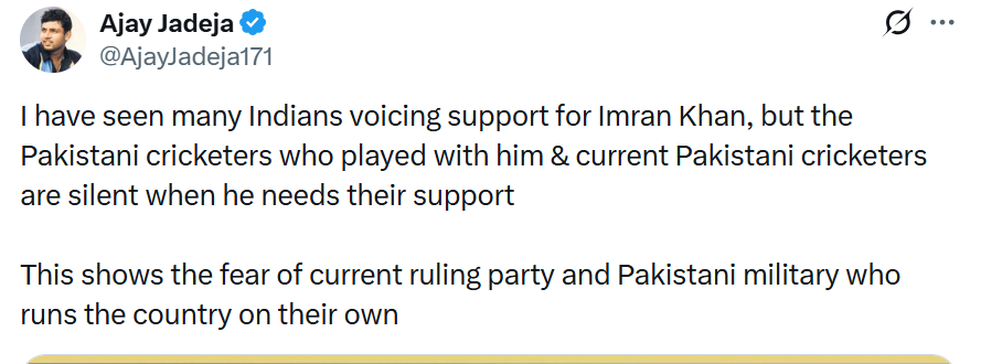 بھارت کے سابق کرکٹرز نے بھی عمران خان کی صحت کے حوالے سے تشویش کا اظہار کیا ہے۔ سابق بھارتی کھلاڑی اجے جدیجا نے ایک بیان میں کہا کہ کئی بھارتی شہری عمران خان کے حق میں آواز اٹھا رہے ہیں، جبکہ بعض پاکستانی سابق اور موجودہ کرکٹرز کی خاموشی سوالات کو جنم دے رہی ہے۔