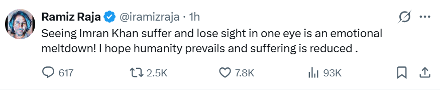 سابق کپتان اور کمنٹیٹر رمیز راجہ نے کہا کہ عمران خان کو تکلیف میں دیکھنا اور ایک آنکھ کی بینائی متاثر ہونے کی خبر سننا انتہائی افسوسناک ہے۔