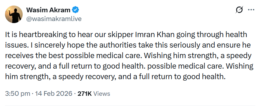 سابق کپتان وسیم اکرم نے اپنی پوسٹ میں لکھا کہ یہ سن کر دل دکھتا ہے کہ ہمارے کپتان صحت کے مسائل سے گزر رہے ہیں۔ انہوں نے امید ظاہر کی کہ متعلقہ حکام معاملے کو سنجیدگی سے لیں اور انہیں بہترین طبی سہولیات فراہم کی جائیں ۔