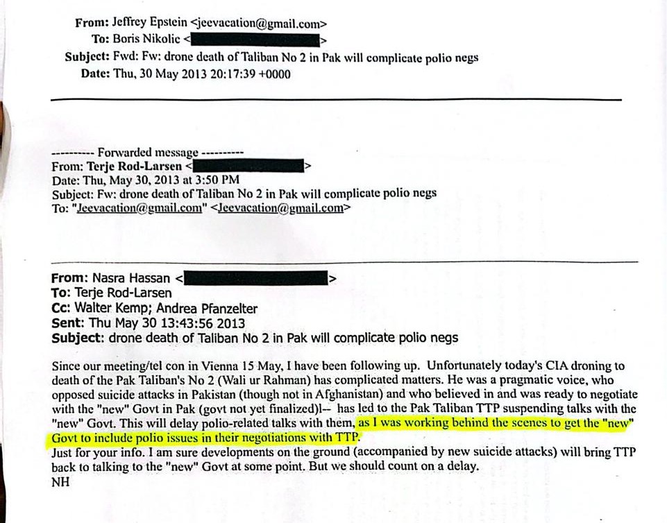 یہ امر بھی قابلِ توجہ ہے کہ جیفری ایپسٹین نہ تو کوئی سرکاری عہدیدار تھے اور نہ ہی صحتِ عامہ کے معاملات سے ان کا براہِ راست کوئی عملی تعلق تھا۔ اس کے باوجود انہیں قبائلی علاقوں کی سیکیورٹی، طالبان کی قیادت، پاک فوج کی سرگرمیوں اور امن مذاکرات کے بارے میں باقاعدہ بریفنگز موصول ہو رہی تھیں۔ ان ریکارڈز میں جگہ جگہ بل گیٹس کا ذکر بھی ملتا ہے اور ایپسٹین اور بل گیٹس کے درمیان ملاقاتوں کا احوال بھی شامل ہے۔
