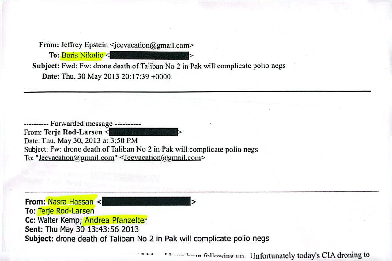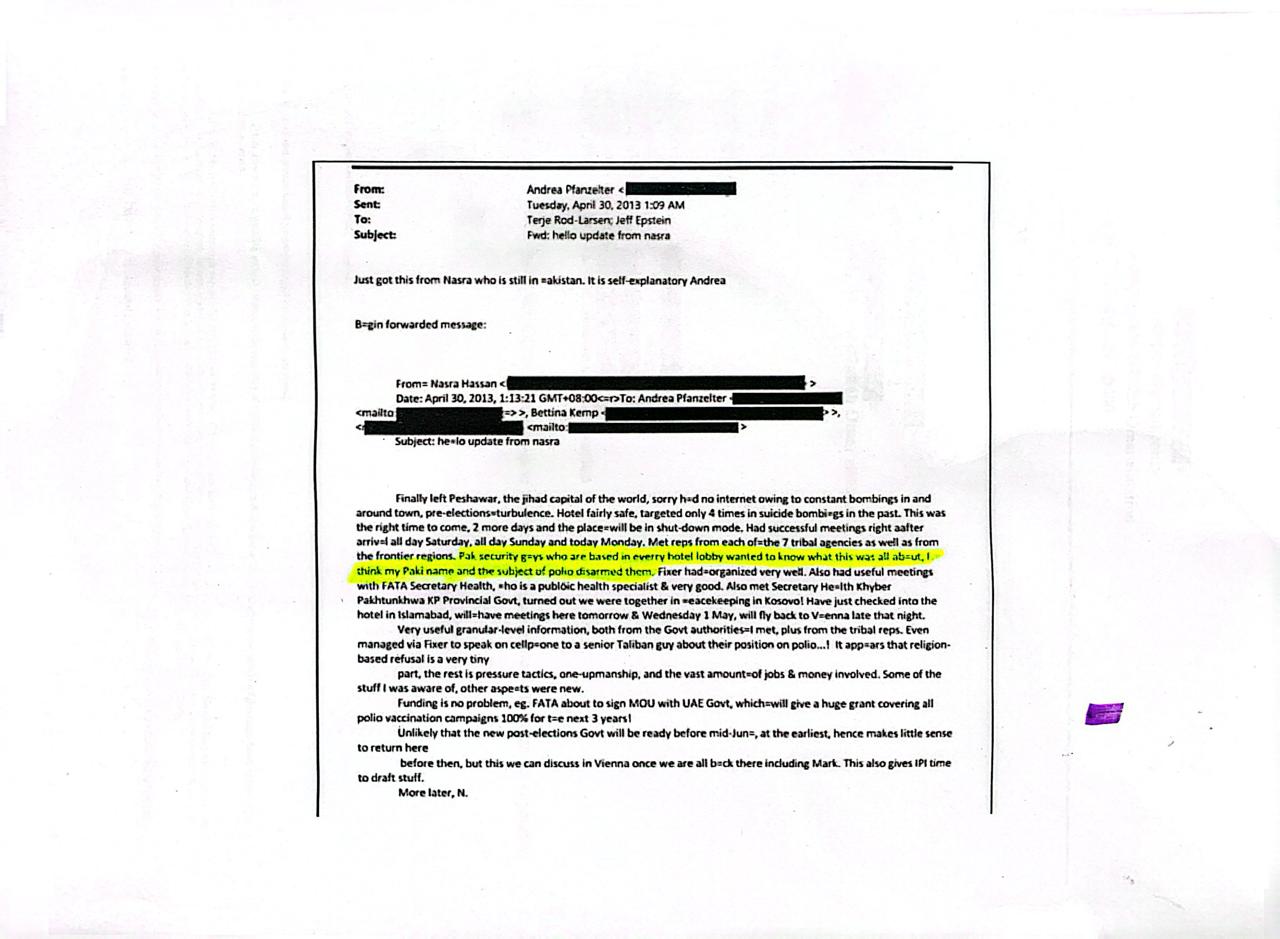 ان ای میلز میں ایک خاتون نصرہ حسن کا بار بار ذکر ملتا ہے، جو انٹرنیشنل پیس انسٹی ٹیوٹ(آئی پی آئی) سے وابستہ تھیں اور پاکستان کے قبائلی علاقوں میں کام کر رہی تھیں۔ دستیاب ریکارڈ سے ظاہر ہوتا ہے کہ نصرہ حسن کی تیار کردہ رپورٹس آئی پی آئی کی ڈائریکٹر آندریا ففانزلٹر کے ذریعے جیفری ایپسٹین کو بھیجی جاتی تھیں۔
