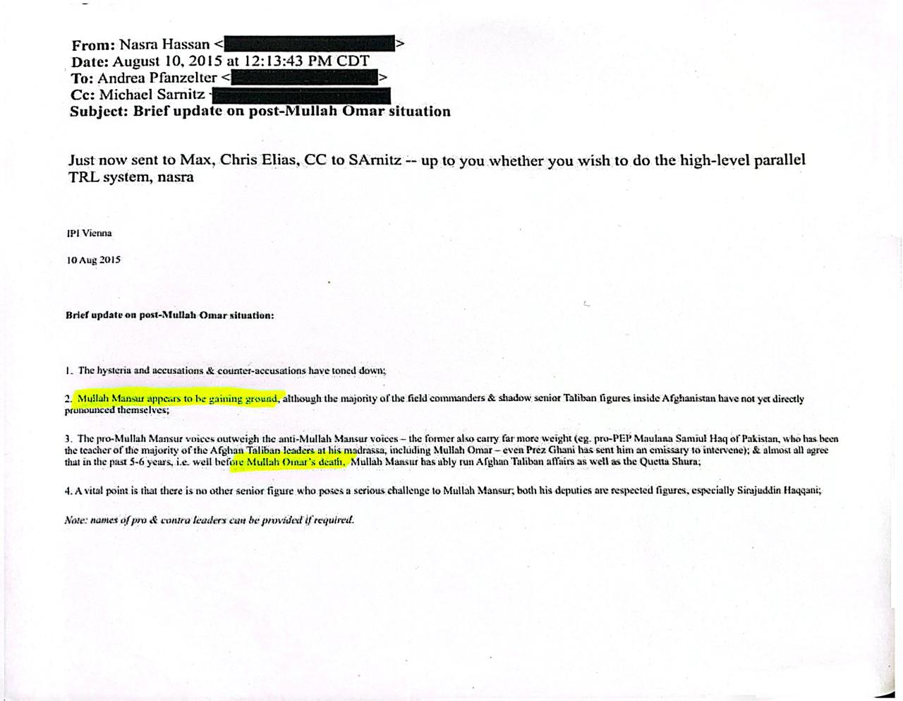 اگست 2015 کی ایک اور ای میل میں افغان طالبان کے سربراہ ملا عمر کی موت کی خبر کے بعد کی صورتحال کا تجزیہ پیش کیا گیا۔ اس خط میں نصرہ حسن نے جیفری ایپسٹین کو آگاہ کیا کہ ملا اختر منصور قیادت کے لیے ایک مضبوط امیدوار کے طور پر ابھر رہے ہیں اور ان کے حامیوں کی تعداد زیادہ دکھائی دیتی ہے۔ ای میل میں امریکی ڈرون حملوں کے تسلسل، افغان امن مذاکرات کے مختلف مراحل اور خطے میں بدلتی سیاسی حرکیات کا بھی ذکر کیا گیا۔